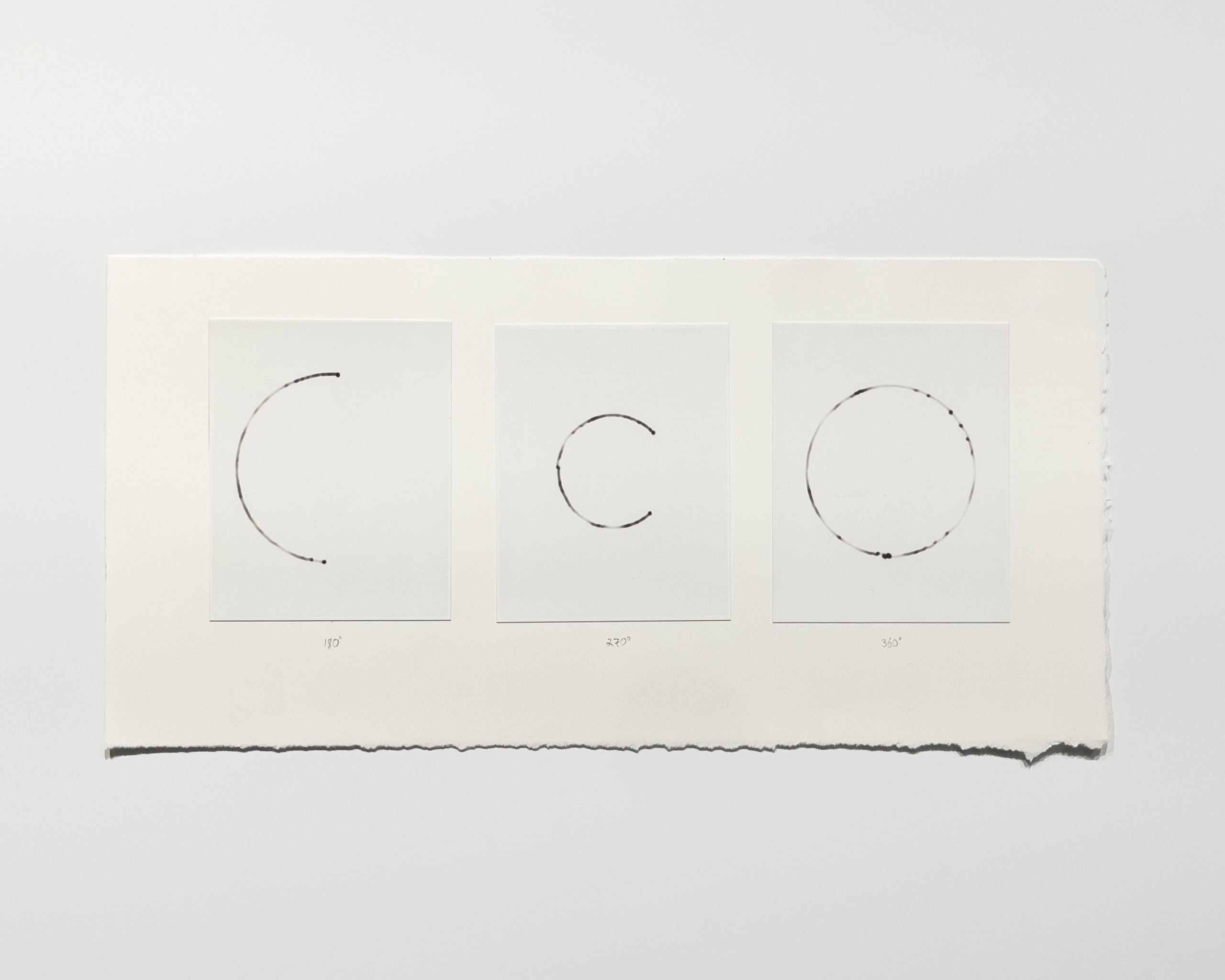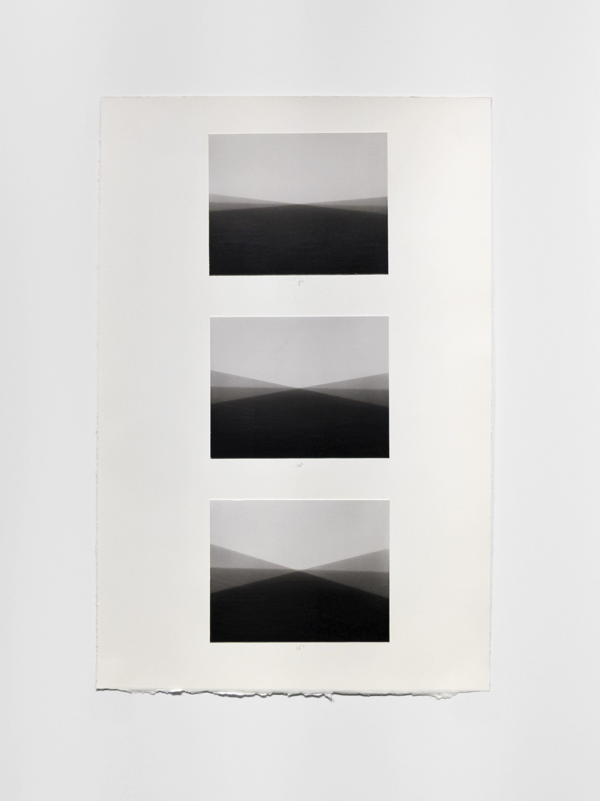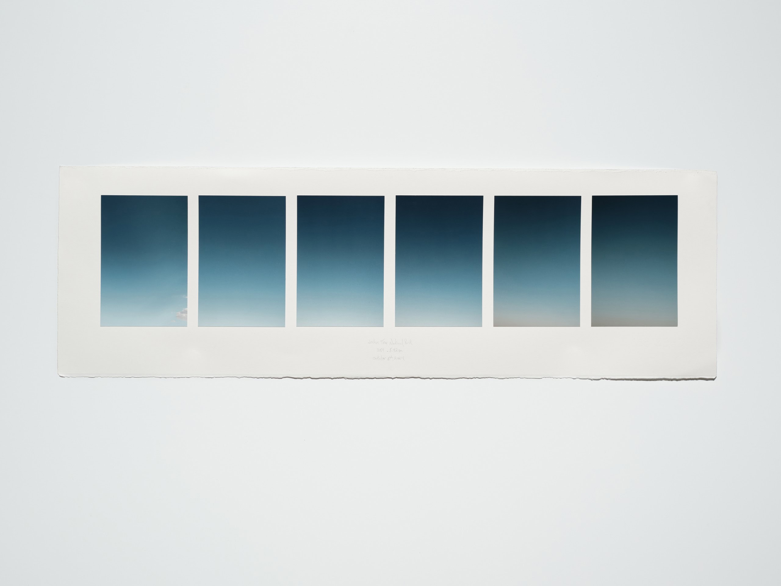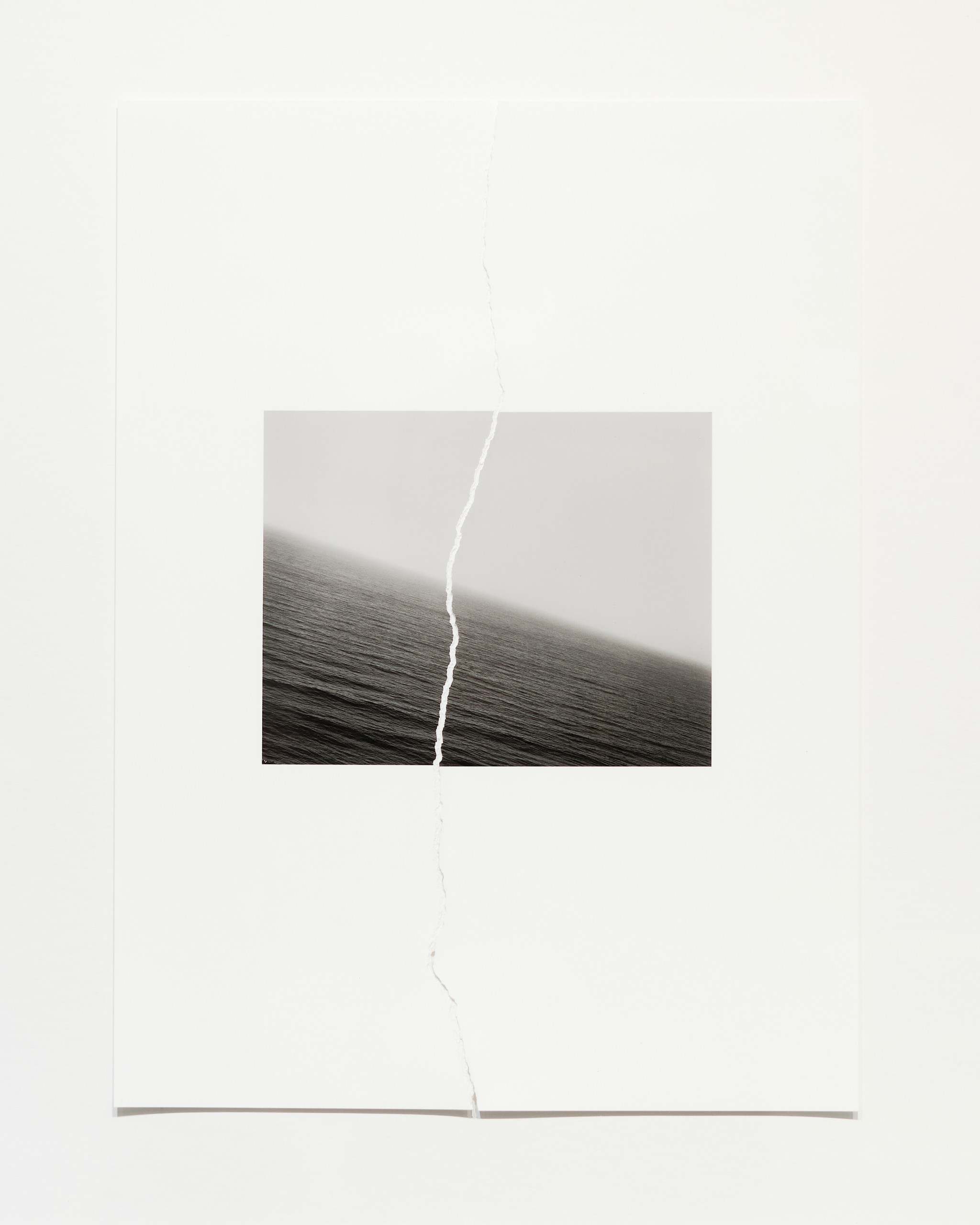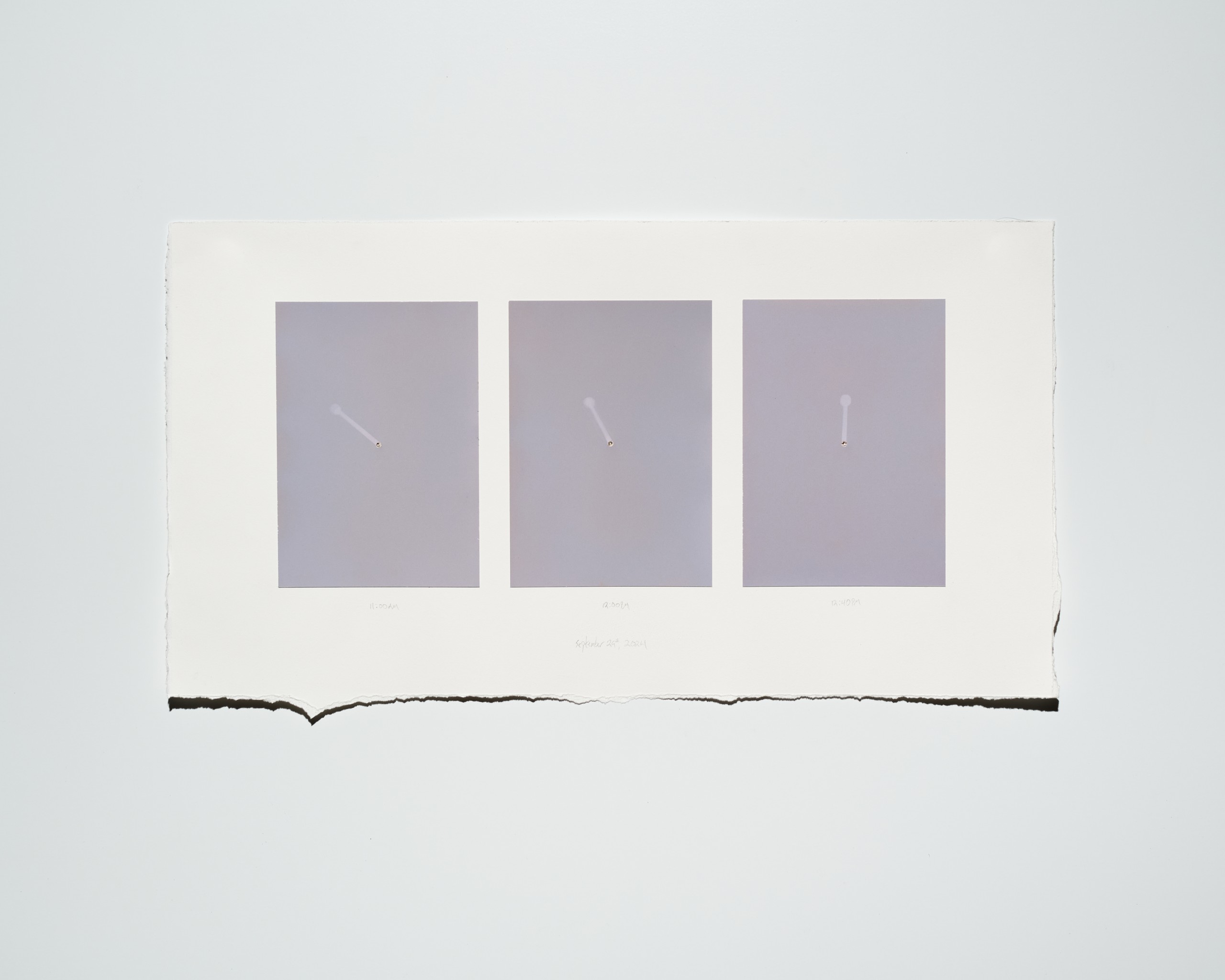 The first work in the exhibition, Westerly Wind, a suspension of a cloud of desert dust sifting through the artist’s hand, almost as if in a cinema still, is more “straightforward” work but still illusionistic and serves as a starting point for the explorations of time to follow. The latest works track time as sunlight fades from various locations. Finally, Heyliger introduces two singular transformations of the work by physically tearing prints and placing the halves side by side—their state permanently altered. The tear evades reproduction and is an action that cannot be performed the same way twice. Altering the print this way is an acknowledgement of the limitations of being human, and a way for the artist to attempt marking a fixed moment in time.