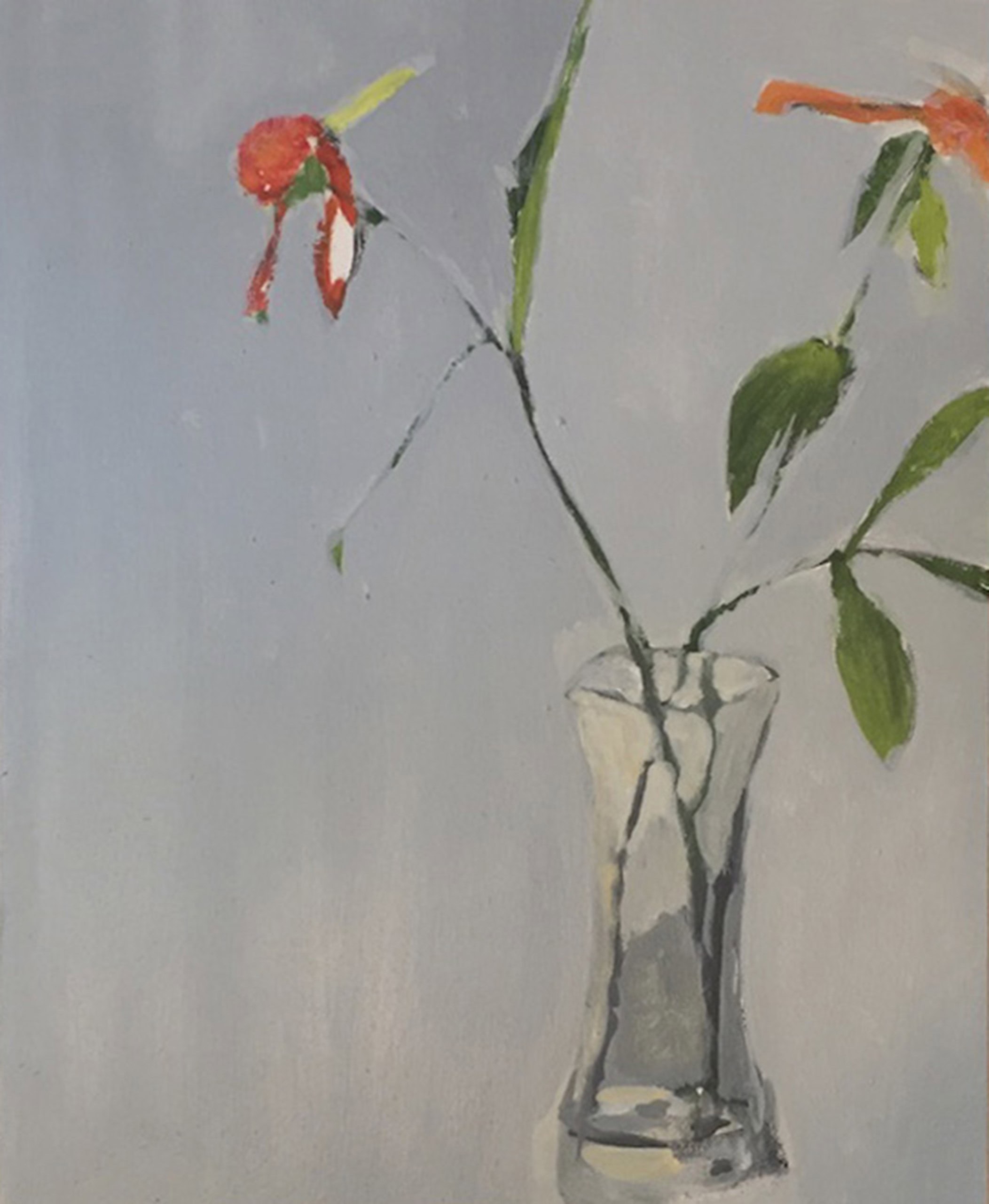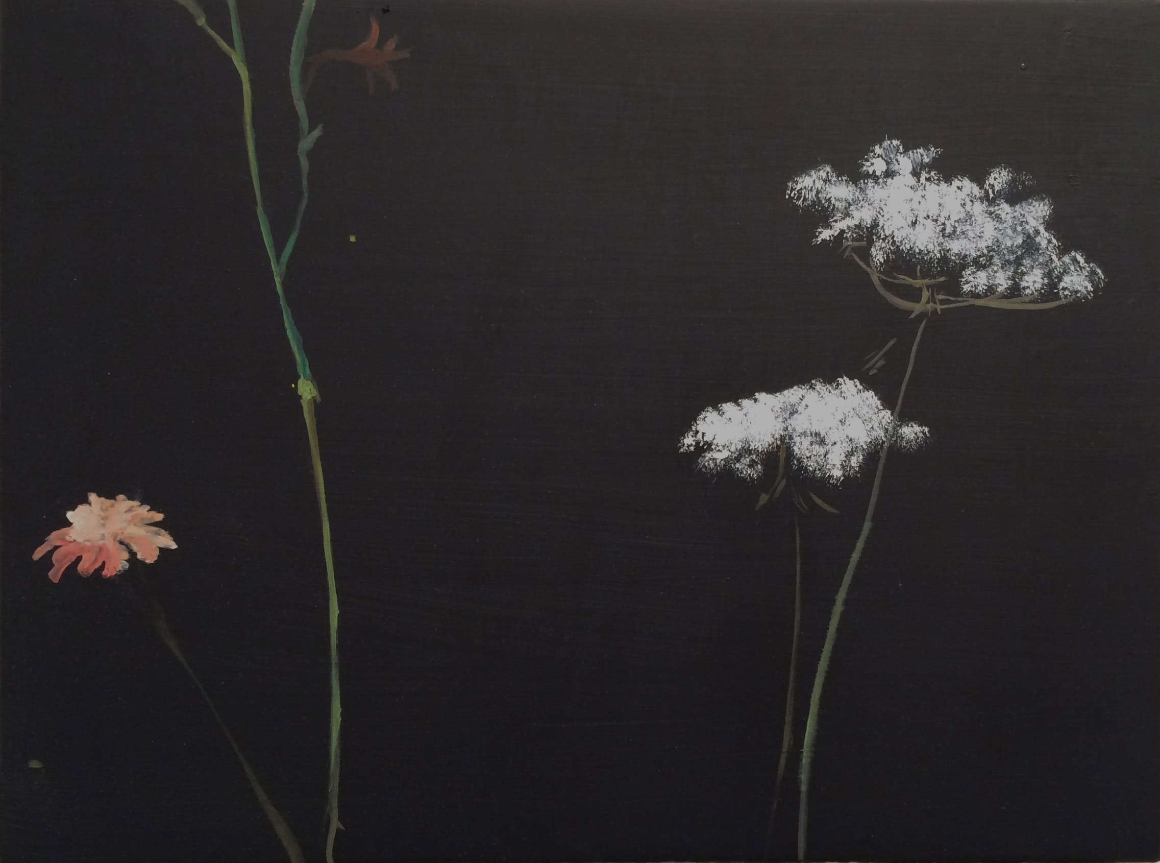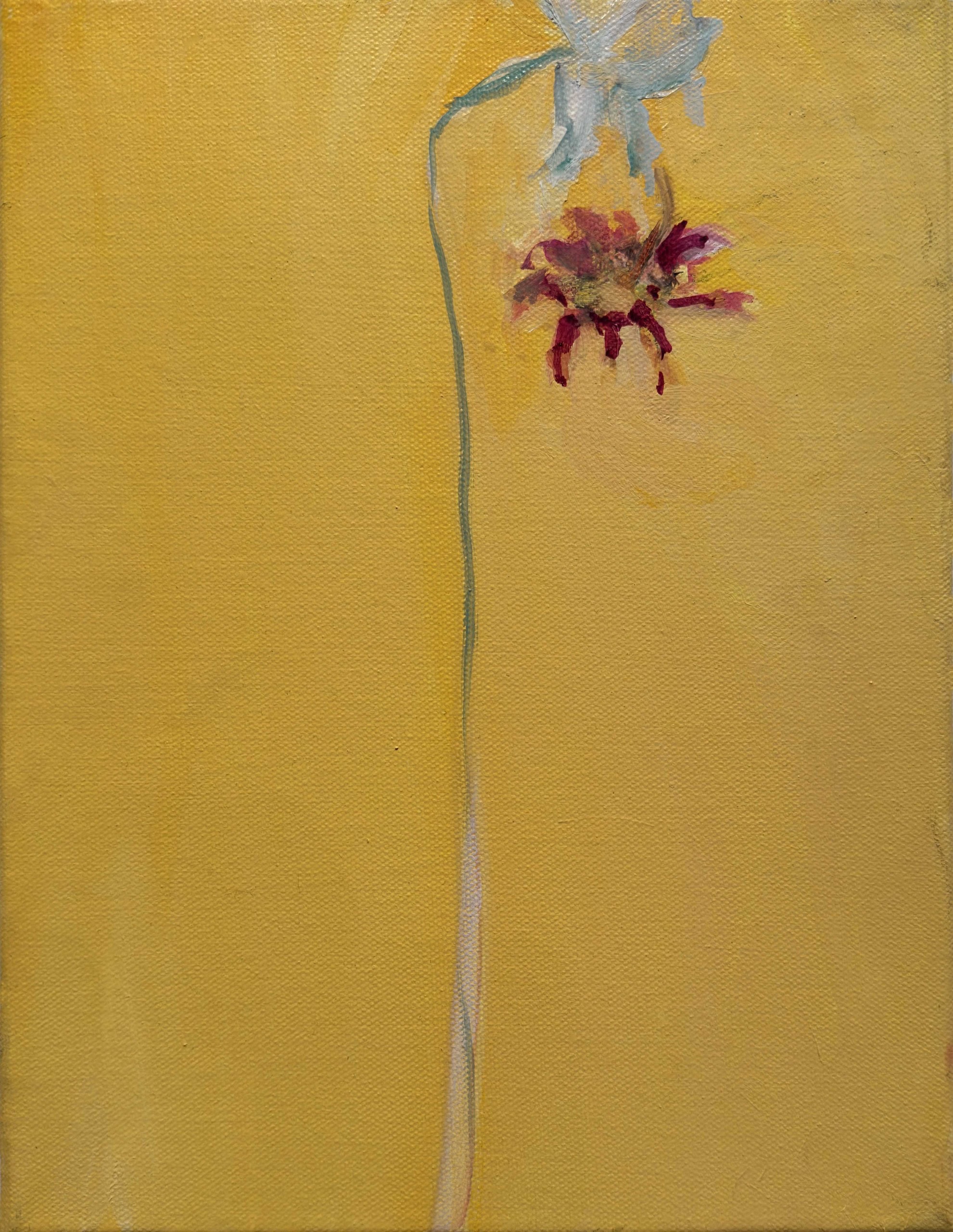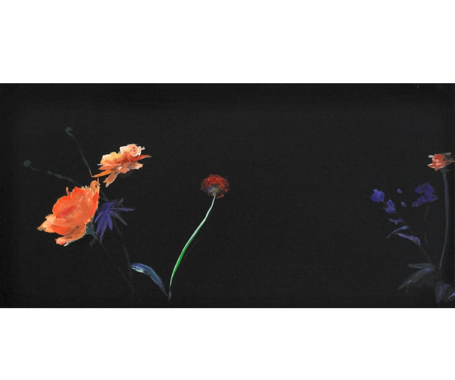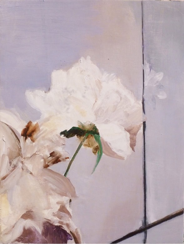 The flower paintings represent a paradigmatic shift in Irons’ style, transitioning from using photographs as references to deriving paintings directly from observation. As such, these new paintings consider a different way of seeing, reinforced by a salon-style hang where the movement of one’s eye across the canvases parallels the motion of the artist’s hand across the canvas. Moments of heartfelt consideration, visual pleasure, or poignant passages echo Irons’ paint handling—the tenuous strokes of pale green that portray a fragile stem, the bristly pointillism of the flower’s luminescent fronds, and the subtly monochromatic shading of the flowers themselves—meditating on the passage of time and the joys of close looking.