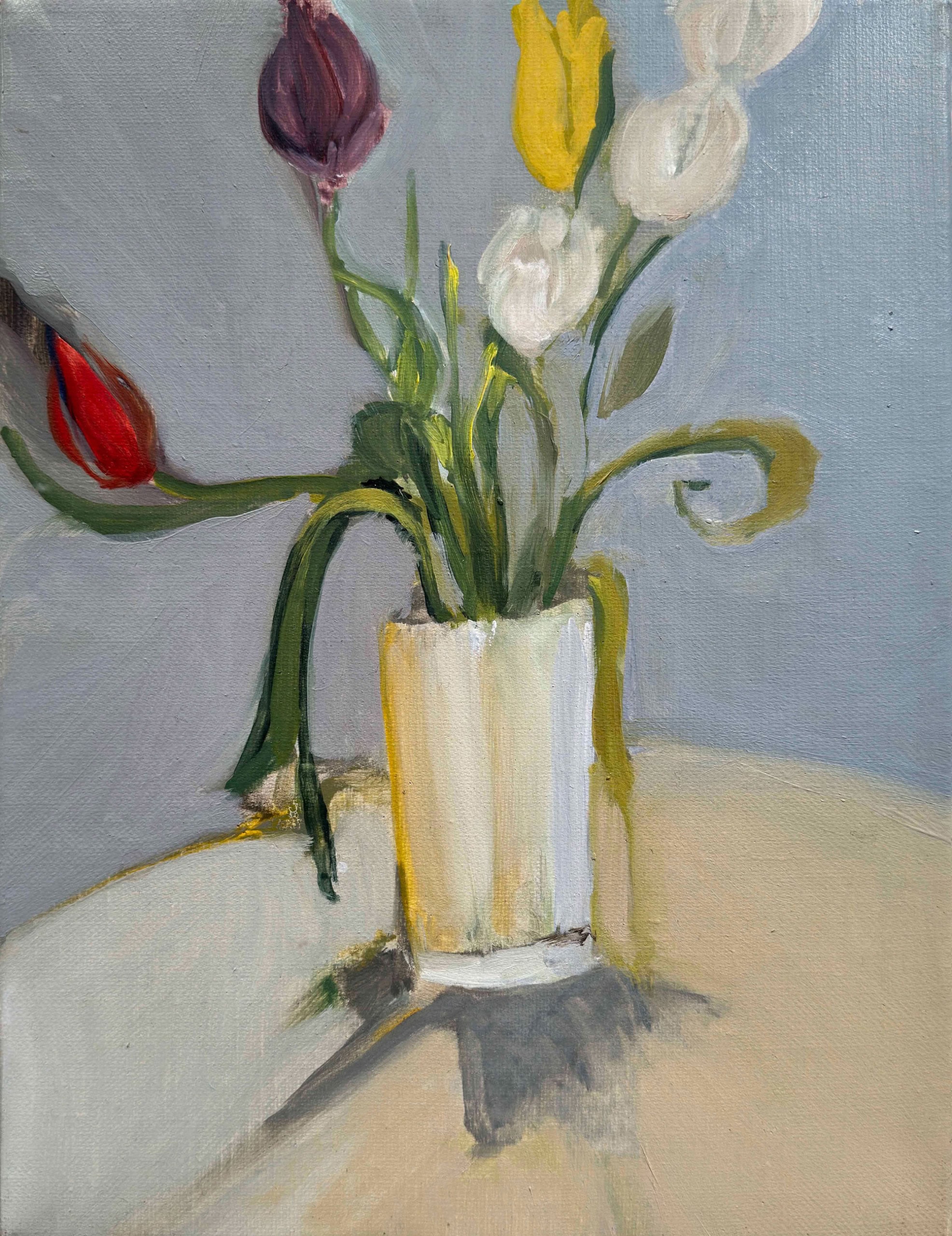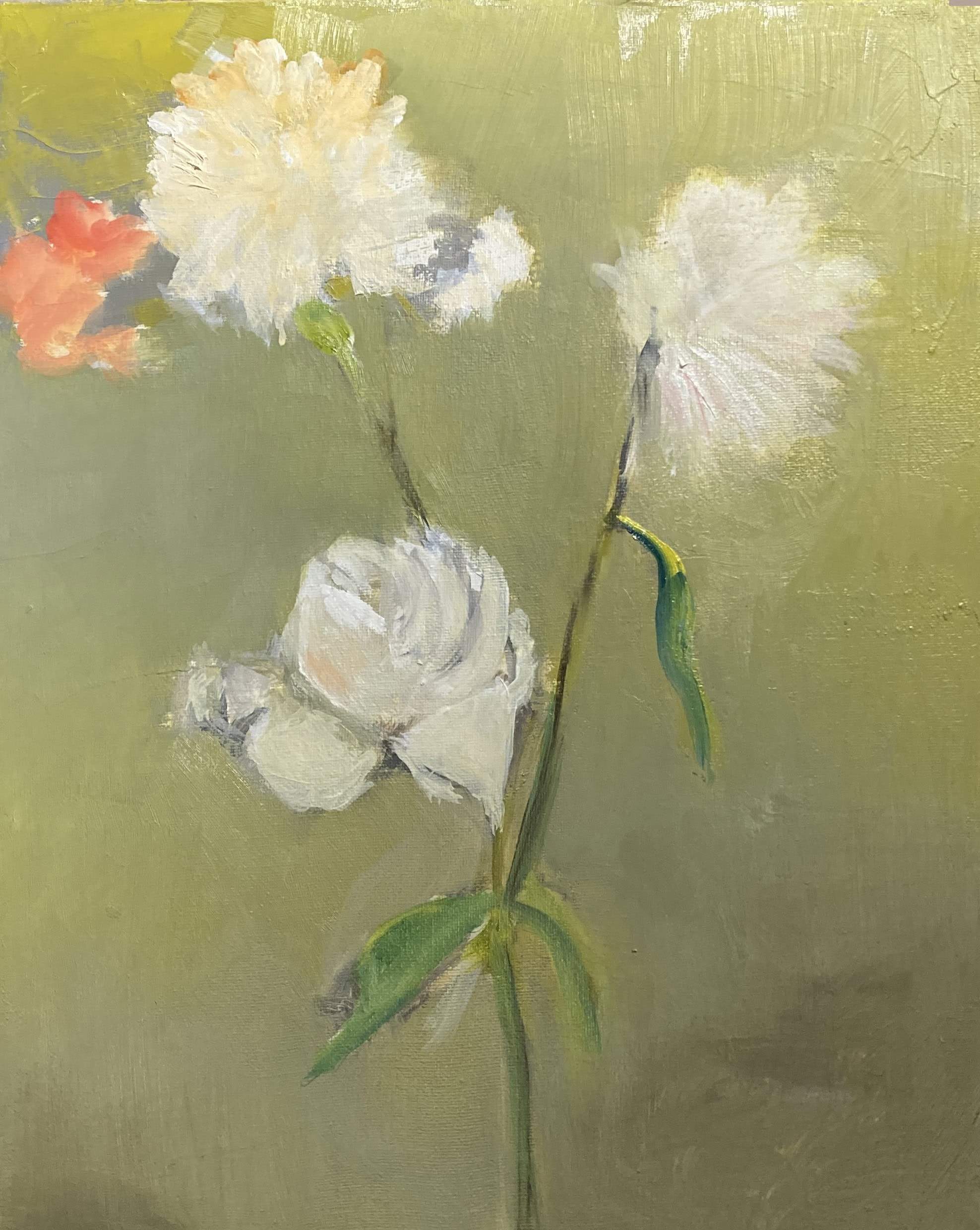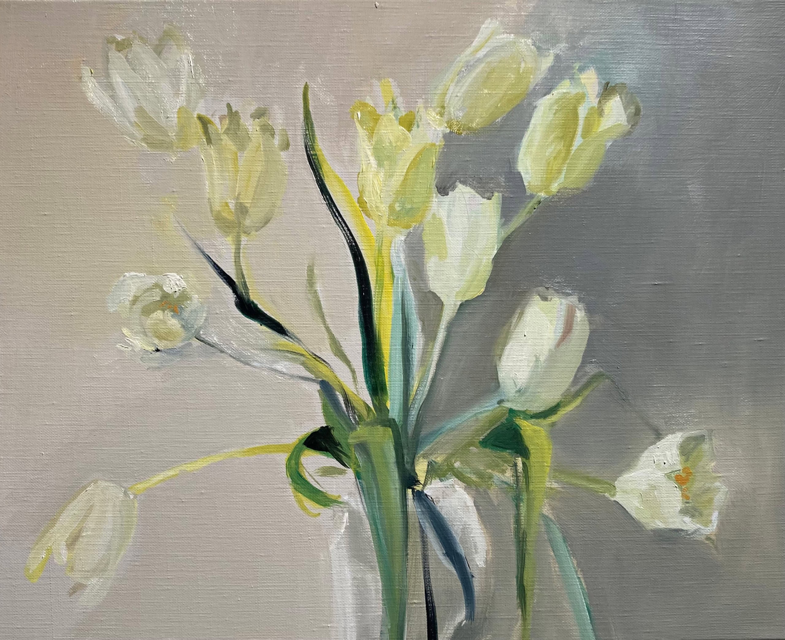 The flower paintings represent a paradigmatic shift in Irons’ style, transitioning from using photographs as references to deriving paintings directly from observation. As such, these new paintings consider a different way of seeing, reinforced by a salon-style hang where the movement of one’s eye across the canvases parallels the motion of the artist’s hand across the canvas. Moments of heartfelt consideration, visual pleasure, or poignant passages echo Irons’ paint handling—the tenuous strokes of pale green that portray a fragile stem, the bristly pointillism of the flower’s luminescent fronds, and the subtly monochromatic shading of the flowers themselves—meditating on the passage of time and the joys of close looking.
