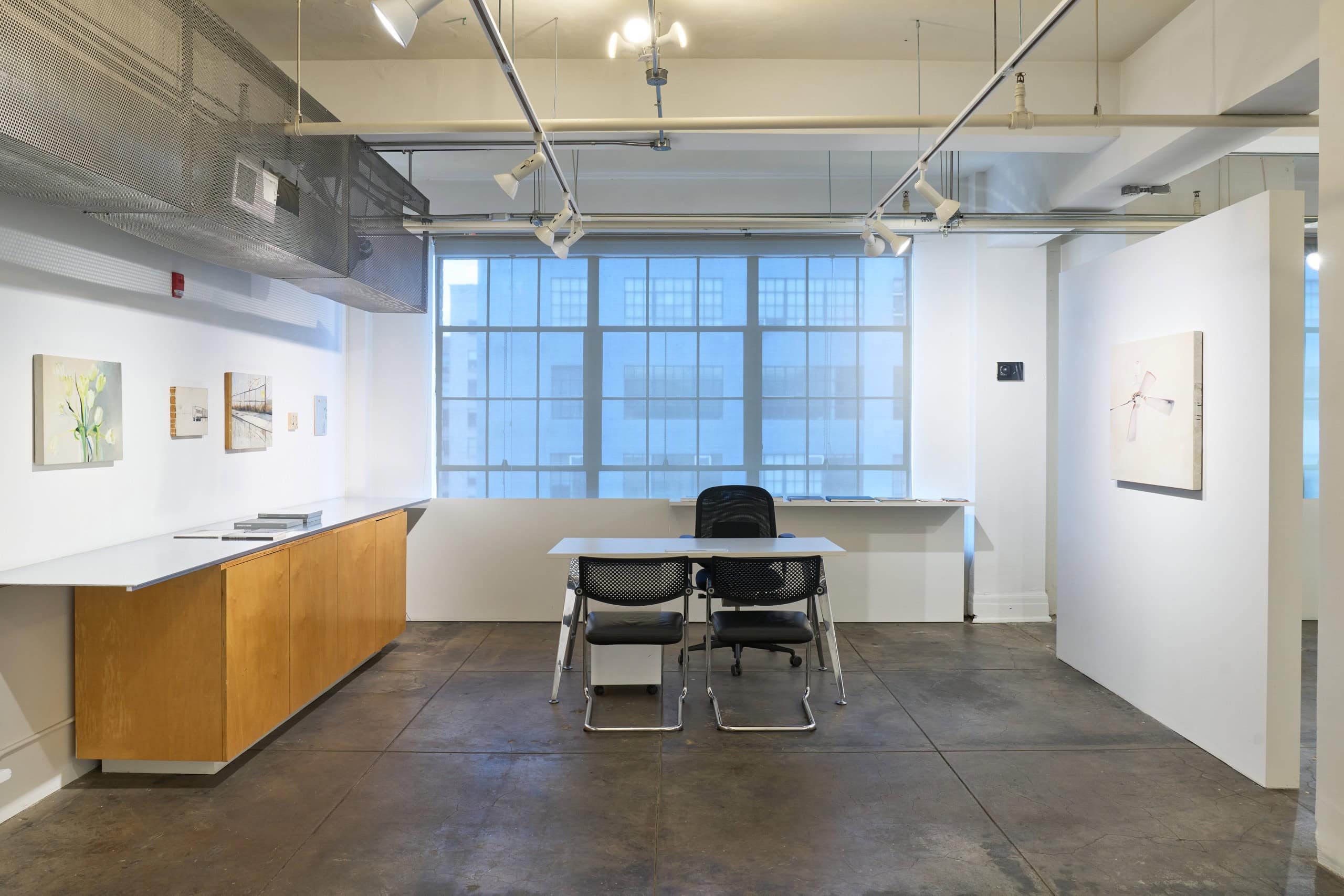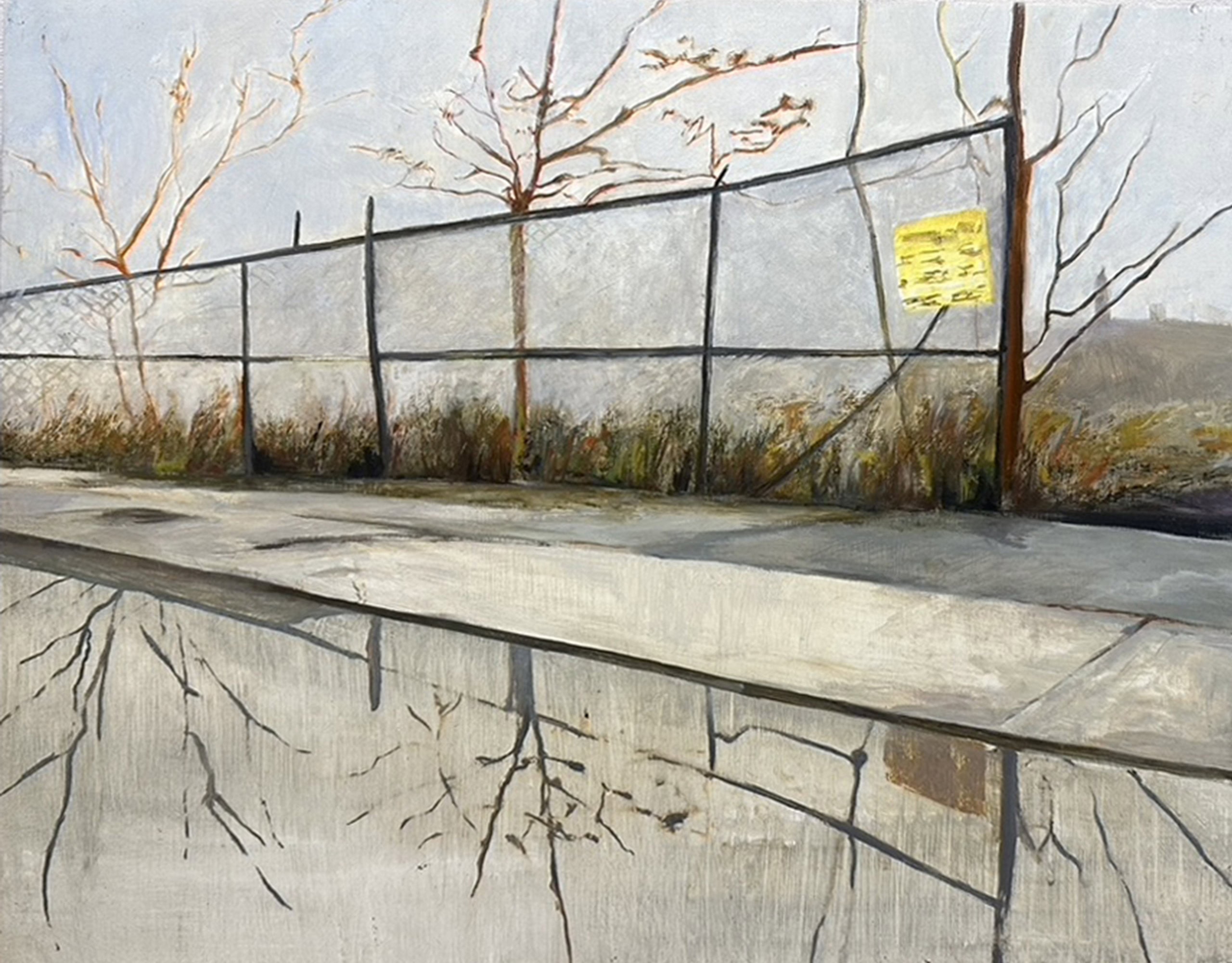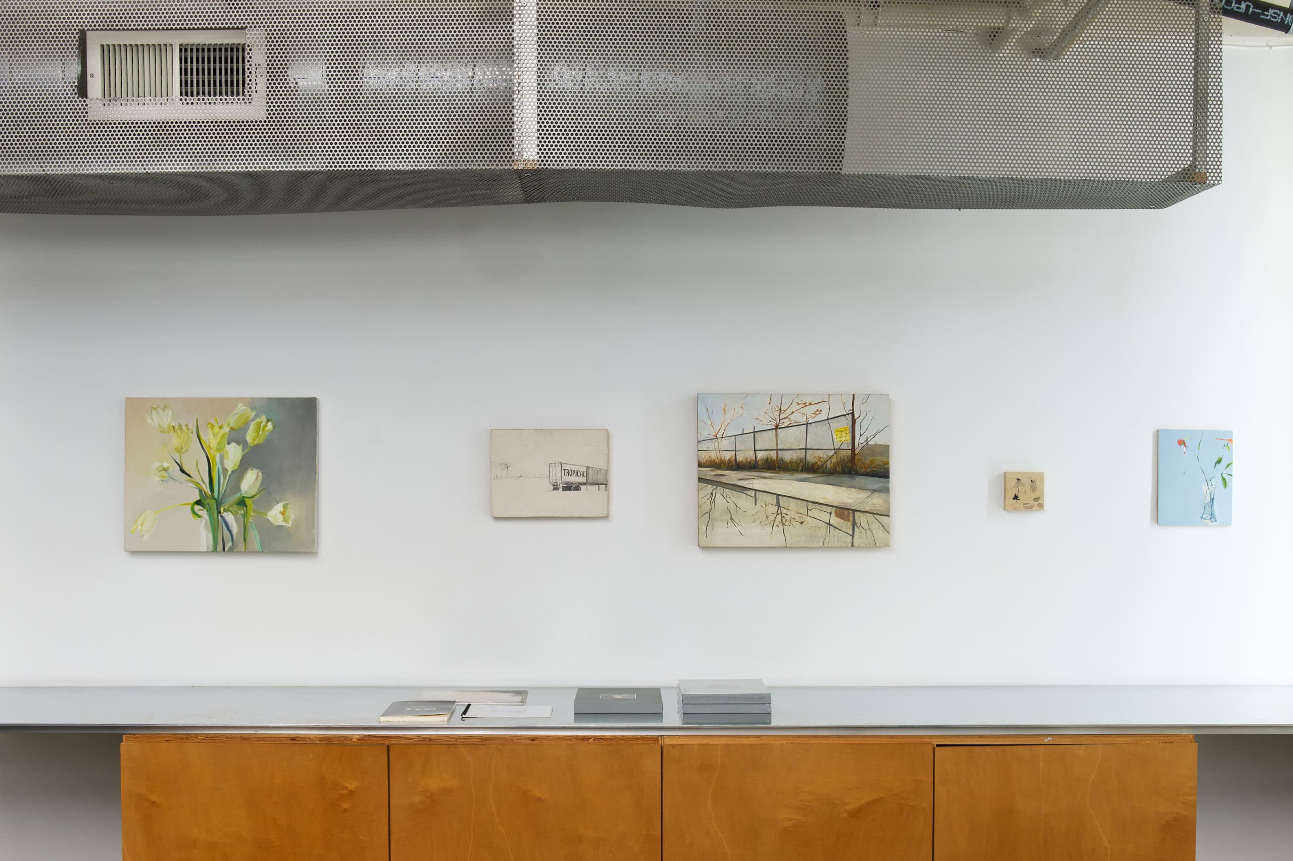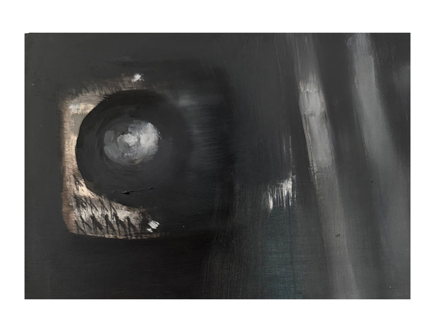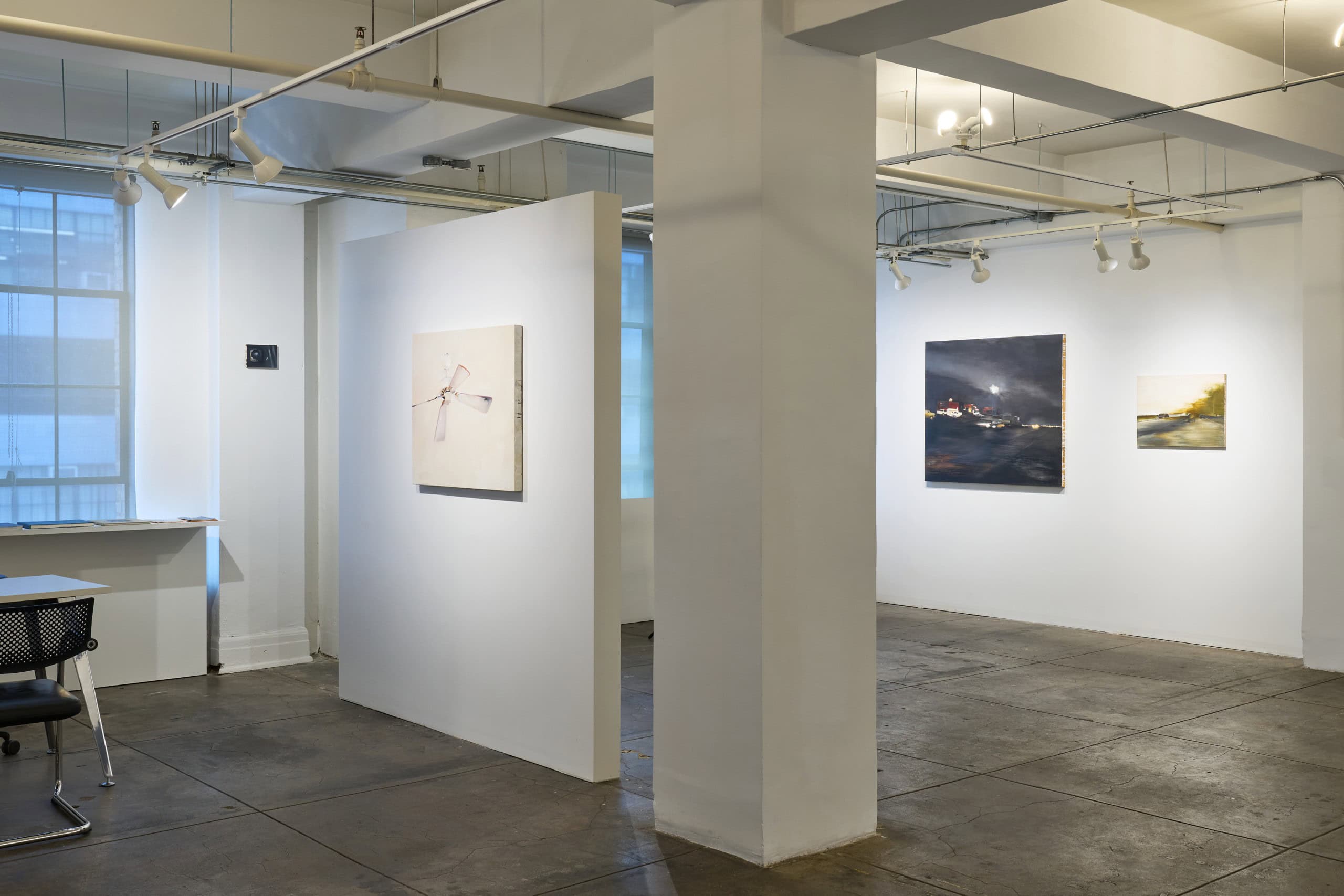 Irons’ subtle oil paintings, made between 1988 and 2019, of landscape fragments and urban interiors based on photographs taken as she drives through urban spaces, blends realistic details with abstract applications of paint to explore how much information is necessary to render an image legible. These fleeting landscape scenes, often capturing the perspective of someone on the move, gives meditative attention to side-glances and everyday objects. Influenced by late Manet, Morris Graves, Janice Biala and particularly Vija Celmins, she extracts moments in the landscape and creates a simple, nuanced rendition of a lamp or a tiny section of the ocean or sky, fleeting moments of infinity.