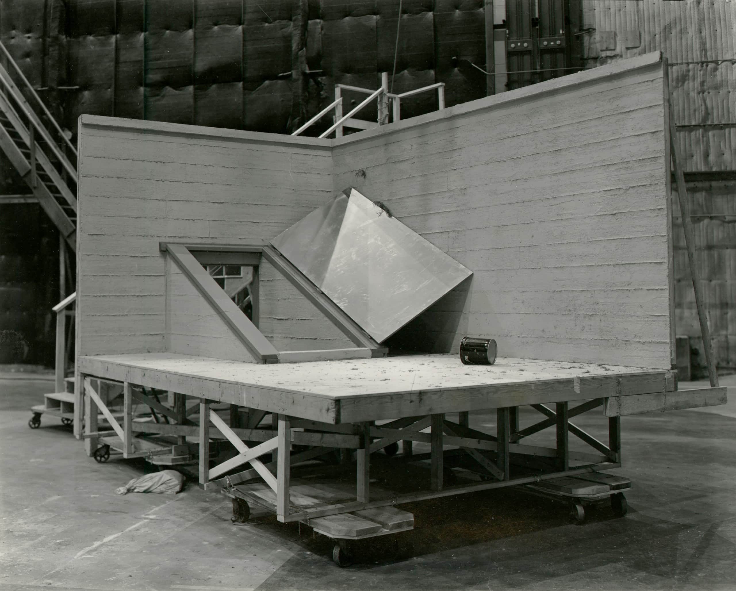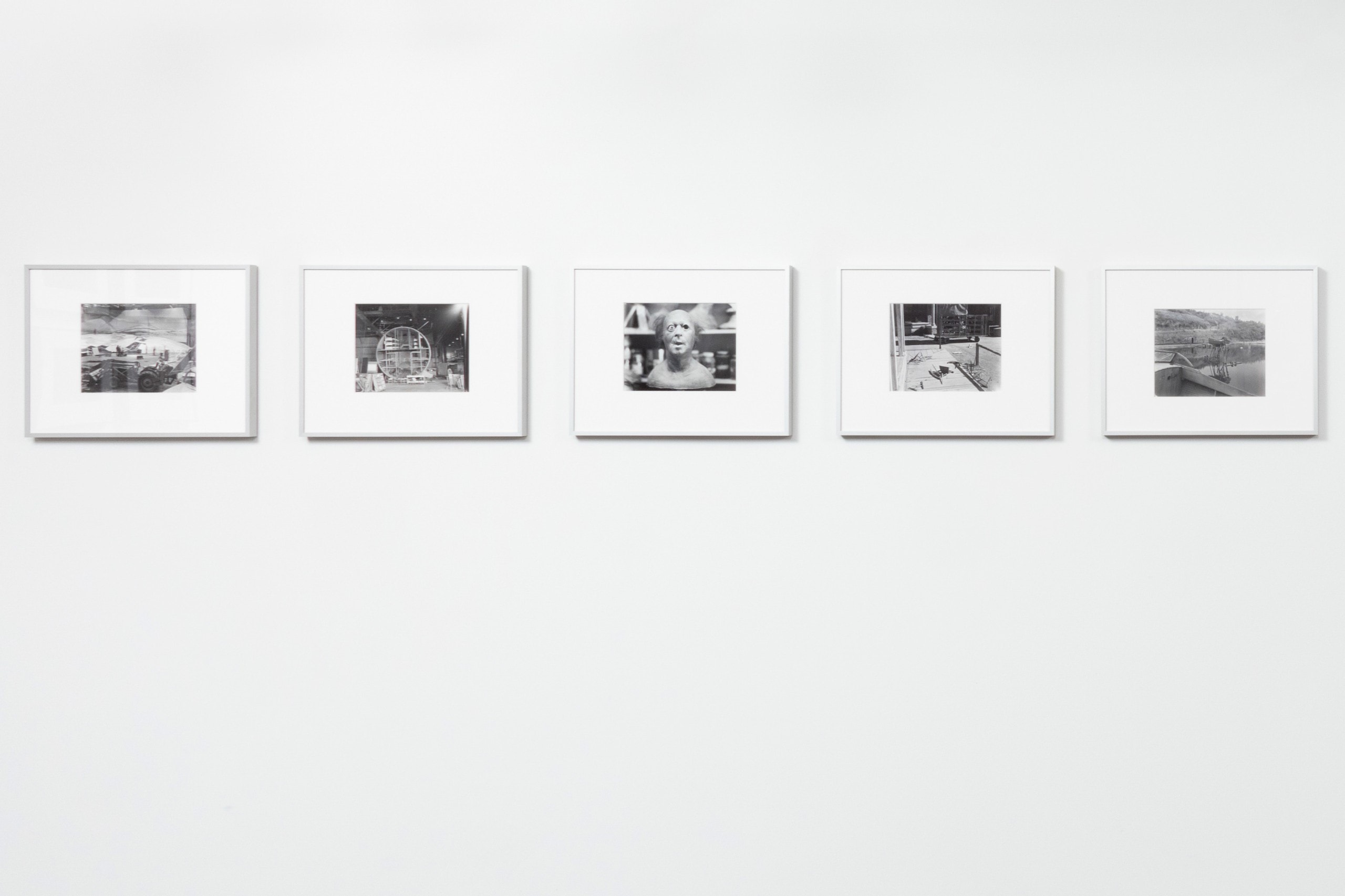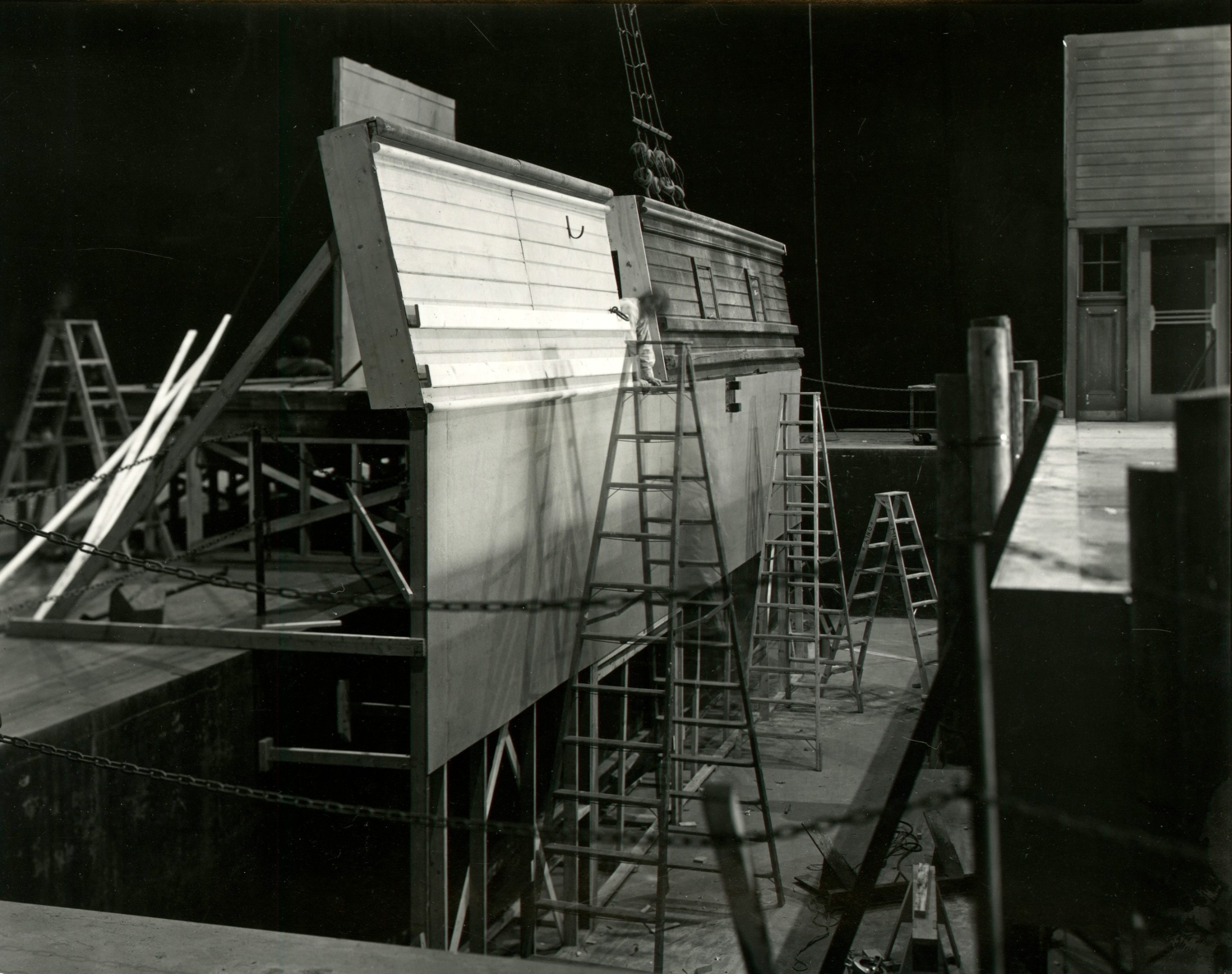 In 1977, Cumming was invited by the studio executive and photo collector Al Dorskind to photograph Universal Studios. For six months, Cumming freely traversed the backlot with his eight-by-ten camera. He found scenes similar to his sculptures but on a much grander scale–readymade rather than fabricated by the artist: an elevated boat and dummy fisherman created for the Universal Studios Tour attraction, a cross-section of a submarine for the naval drama Grey Lady Down (1978). These studio elements became sculptural once photographed. To Cumming, they were akin to “involutions,” puzzles inviting a viewer to untangle, and “documents of the hardware employed in the ultimate illusion.”
