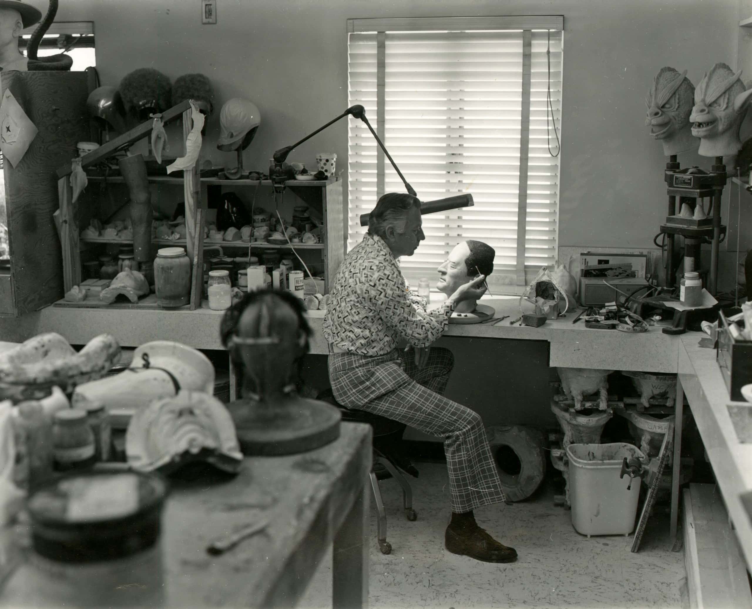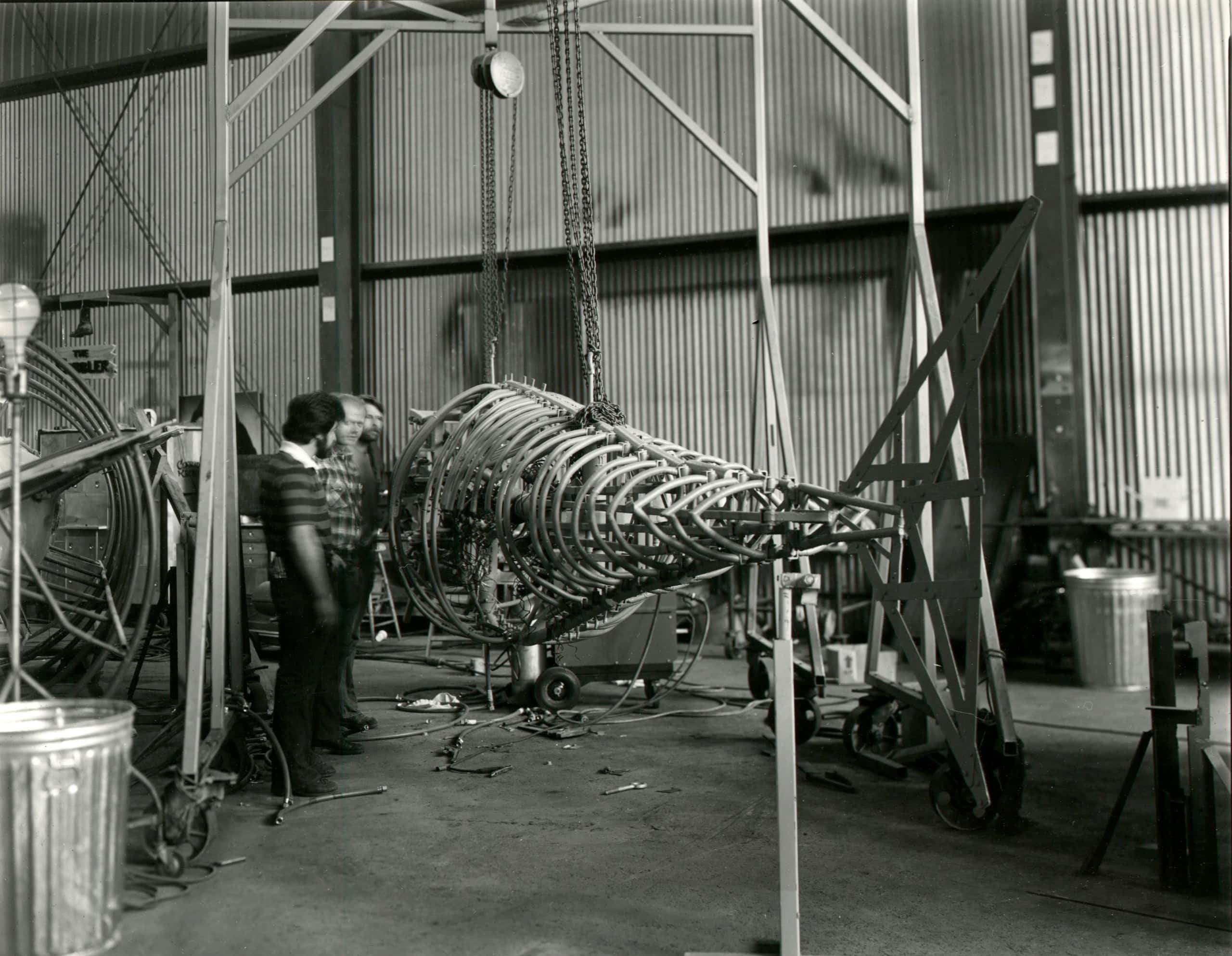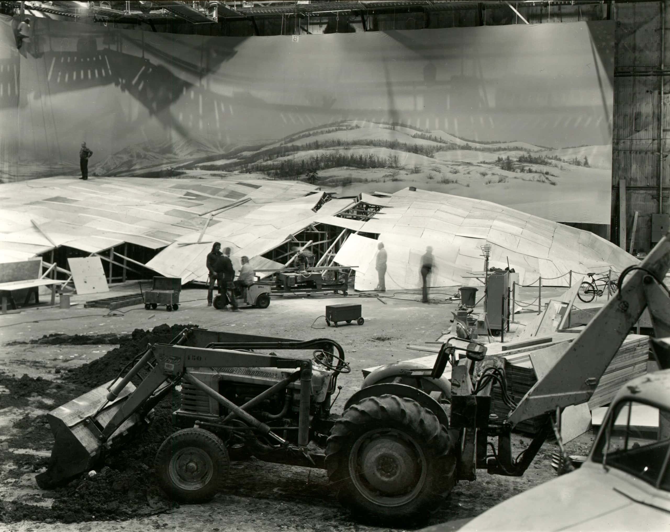 In 1977, Cumming was invited by the studio executive and photo collector Al Dorskind to photograph Universal Studios. For six months, Cumming freely traversed the backlot with his eight-by-ten camera. He found scenes similar to his sculptures but on a much grander scale–readymade rather than fabricated by the artist: an elevated boat and dummy fisherman created for the Universal Studios Tour attraction, a cross-section of a submarine for the naval drama Grey Lady Down (1978). These studio elements became sculptural once photographed. To Cumming, they were akin to “involutions,” puzzles inviting a viewer to untangle, and “documents of the hardware employed in the ultimate illusion.”