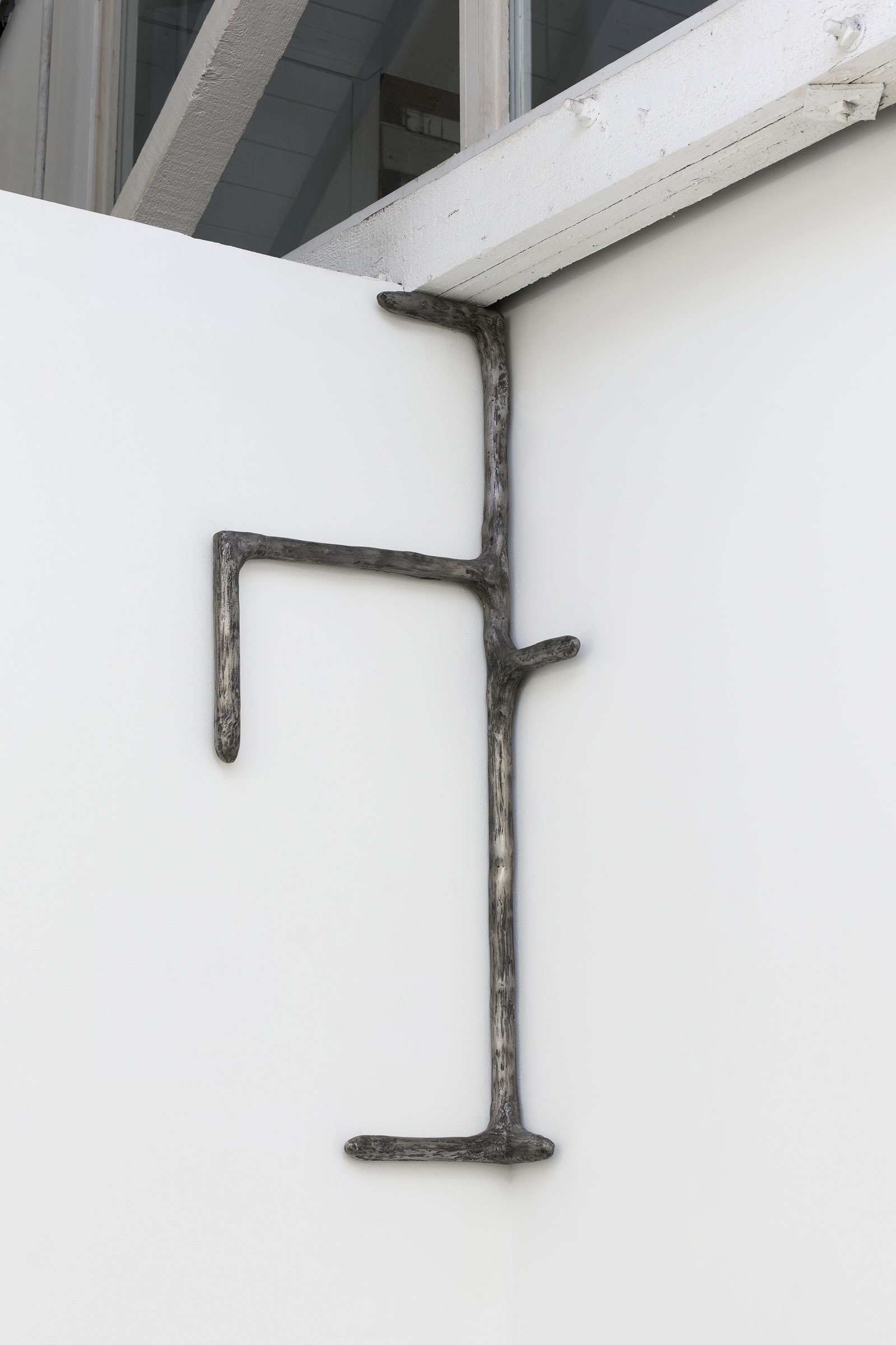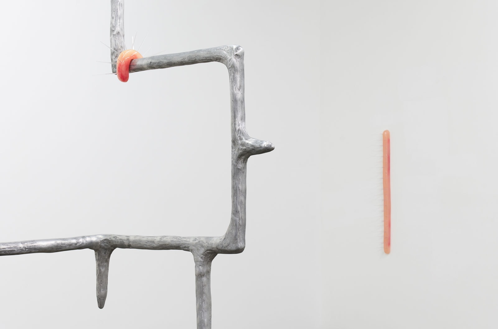 Lofgren presents two different types of sculptures: DEFENDERS (spiky, electrically colored resin objects) and a series of portals (sleek, steel figures) titled, PULLING THROUGH. Inspired by lethal tropical caterpillars, the DEFENDERS allude to the intensification of beauty amidst ecosystem collapse, a tragedy witnessed by the artist during research in the Amazon rainforest (2015-2018). The portals respond to ancient healing rituals, which entail movement through peculiar thresholds, such as the rungs of a bed or two graves underground. As viewers circulate around the gallery – perhaps noticing how the sculptures index their own limbs and orifices – they are invited to reflect on a series of transformations, including symbolic rebirth, the transference of a disease, the absorption of an object, or the creation of a barrier between a patient and his or her ailment.