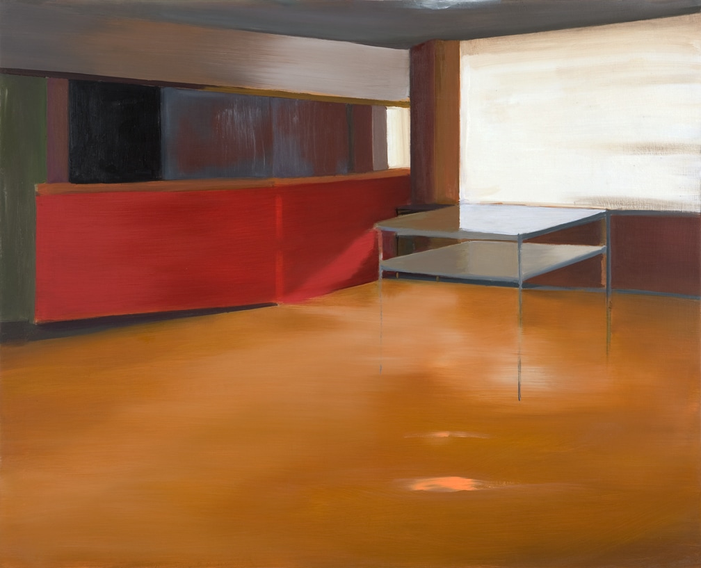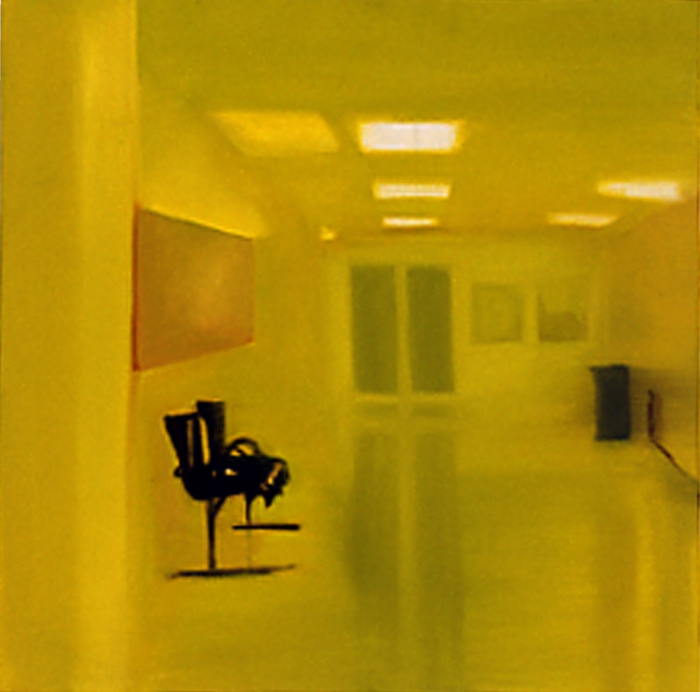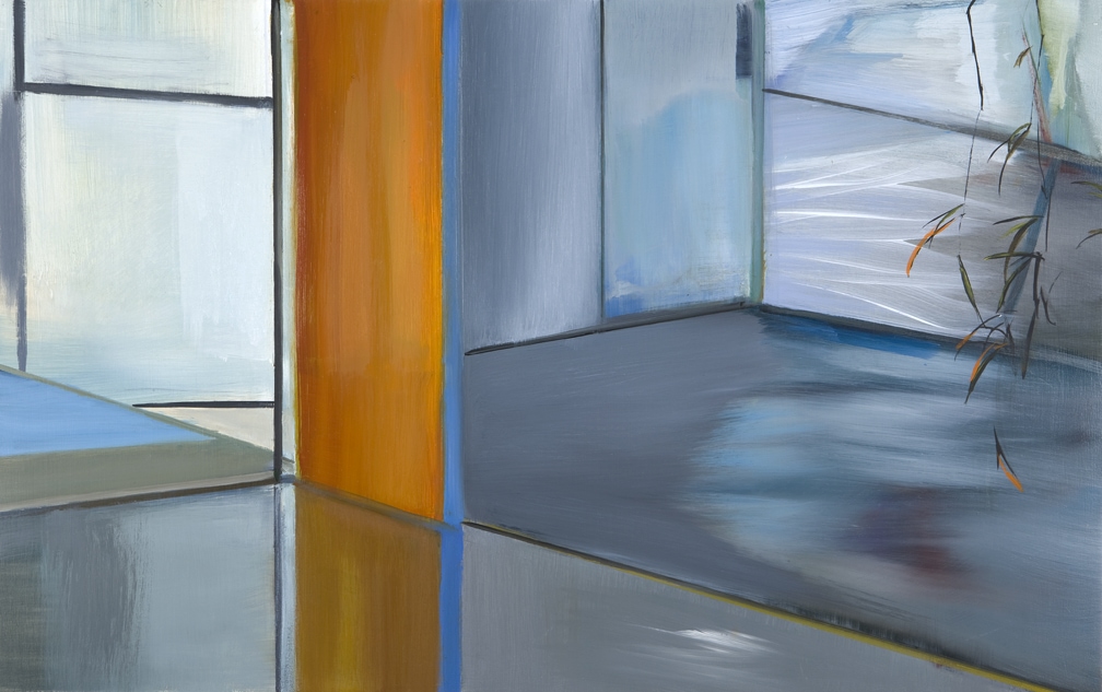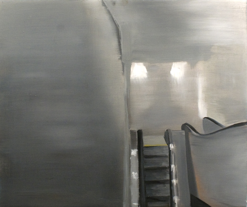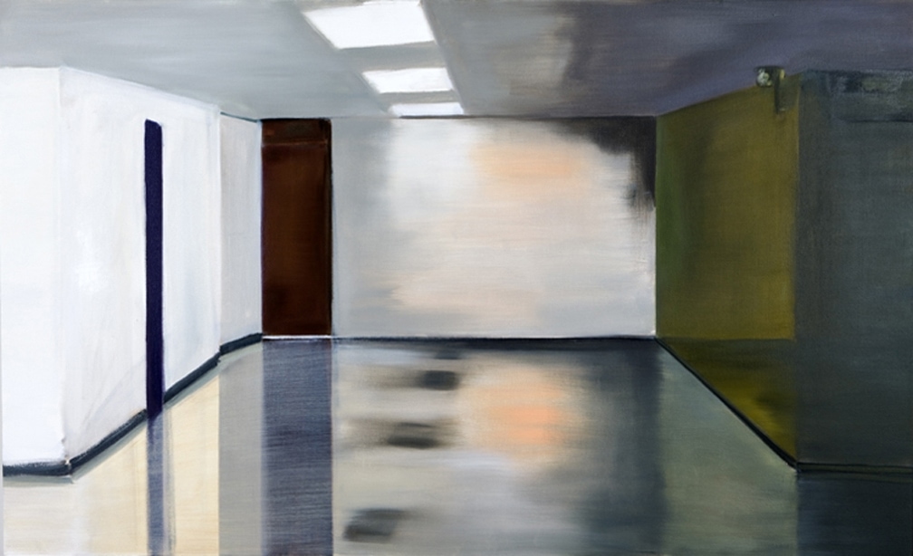 Seemingly drawing on the language of still lives and documentation, Irons’ paintings often find their well-source from photographic materials. Like the deadpan mimesis of a throwaway snapshot, the focus of her paintings often describe unremarkable elements of the every day, as we blindly learn to forget them. Chairs, doors, and plants reside in the plaintive silence of empty offices and building hallways, devoid of the human presence. Dispersed through various paintings are contours of colors that impel the appearance of abstract painting, though this too is transient, and affords a bare minimum of information. Tempering the impulse towards the epic and the auratic through use of simple monochromatic tones over emotionally oblique interiors, in these paintings, Irons’ brushstrokes are only loosely held in check by the rigid geometries of the spaces’ design, inferring a human gesture; what appears mundane and unveils the emotive value underneath the paintings’ immediate remove. Irons paintings are conduits to retrospection, leading the viewer into a climate of both transience and anxiety, of witnessing the wholly familiar and anonymous, and the experience of remembering such: what we do with things we don’t know to forget. The soft render of Irons’ palette limns the institutional coldness of buildings with this basic need to see ourselves as relevant in our time, if only through the lens of approximated memories.