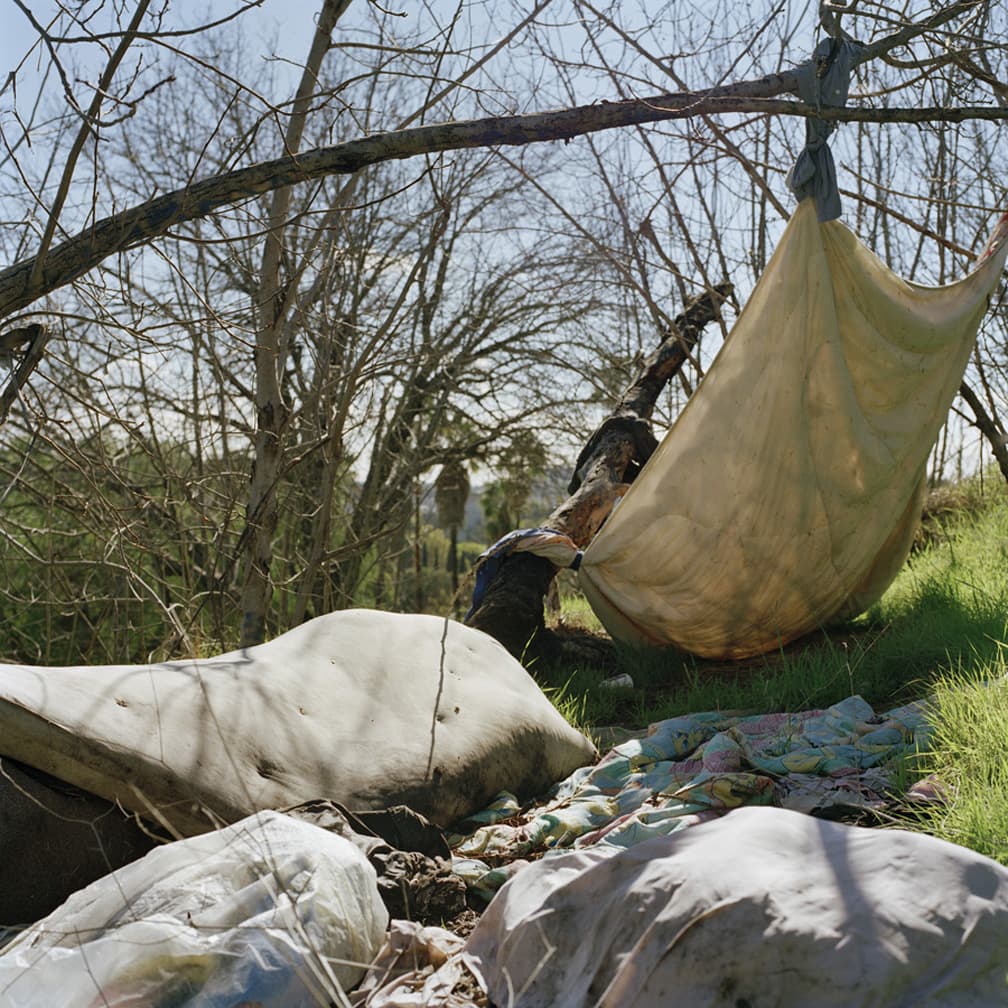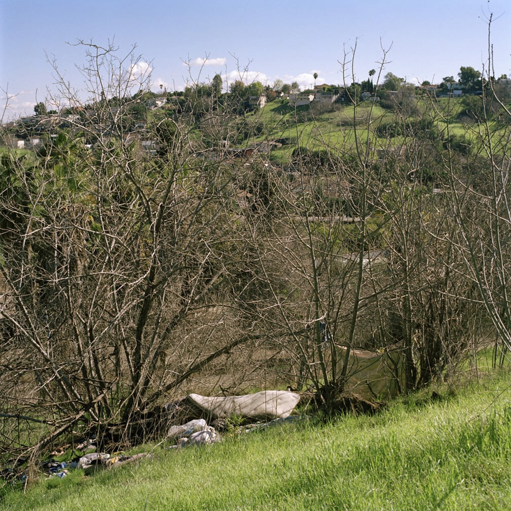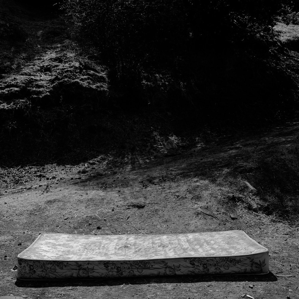 Los Angeles, she combined narrative text with the images, giving viewers a political context for her urban images. With Sereno, Fernandez eliminates all text. This streamlines and simplifies the body of work, but allows for a broad range of interpretations. One possible interpretation of Bench (Deb’s Park) is that the unfocused background points to the vast distance between the dream of home ownership in LA and the reality of life in the midst of the economic downturn. The closest many Angelinos will get to a house in the suburbs is sitting on this bench. Works such as Couch or Encampment II offer both a meditation on the serenity of the neighborhood and a sense of loss and ruin indicated by decomposing furniture, dry brush, and brown, blatantly denying the image of a “golden” California landscape.