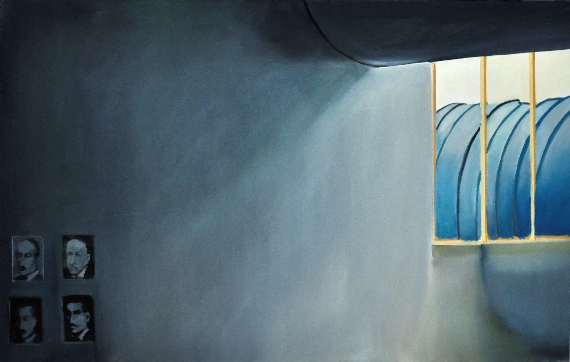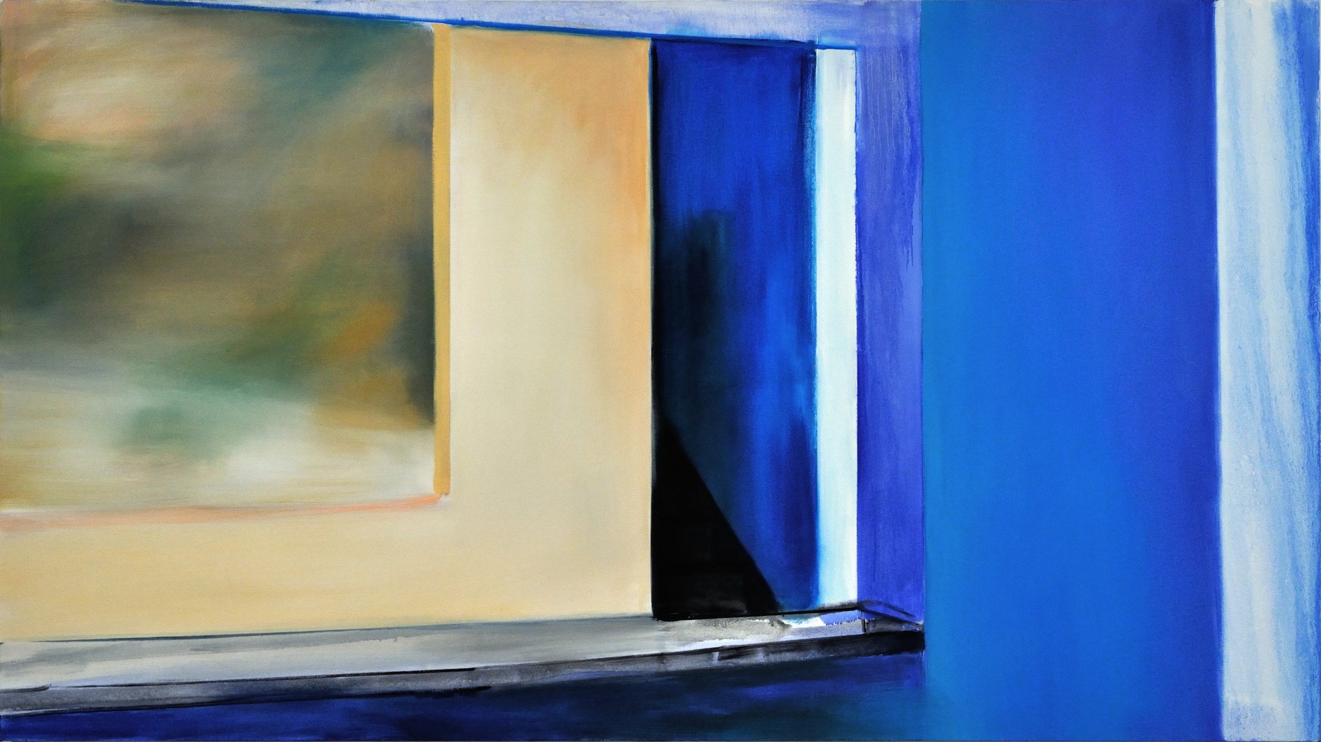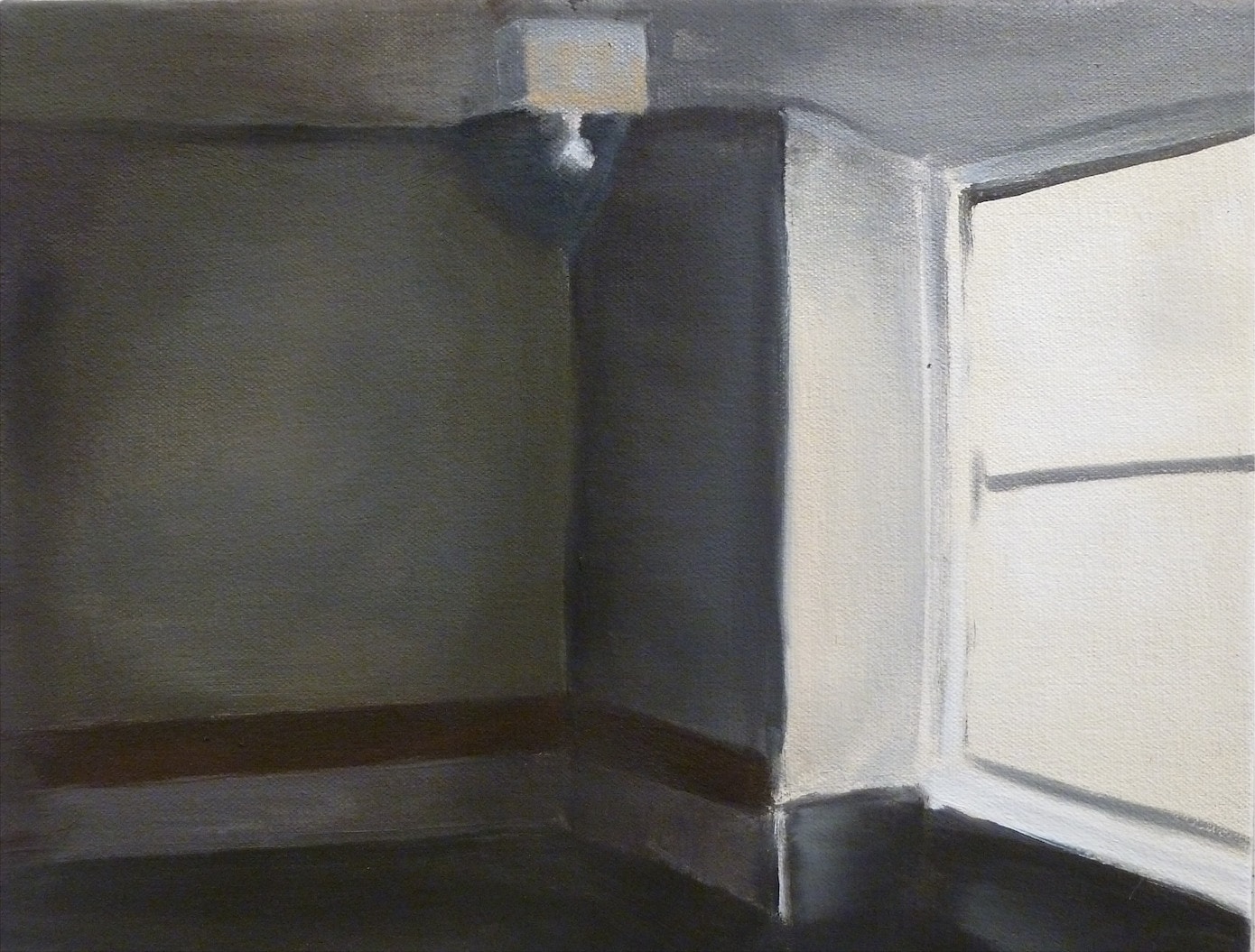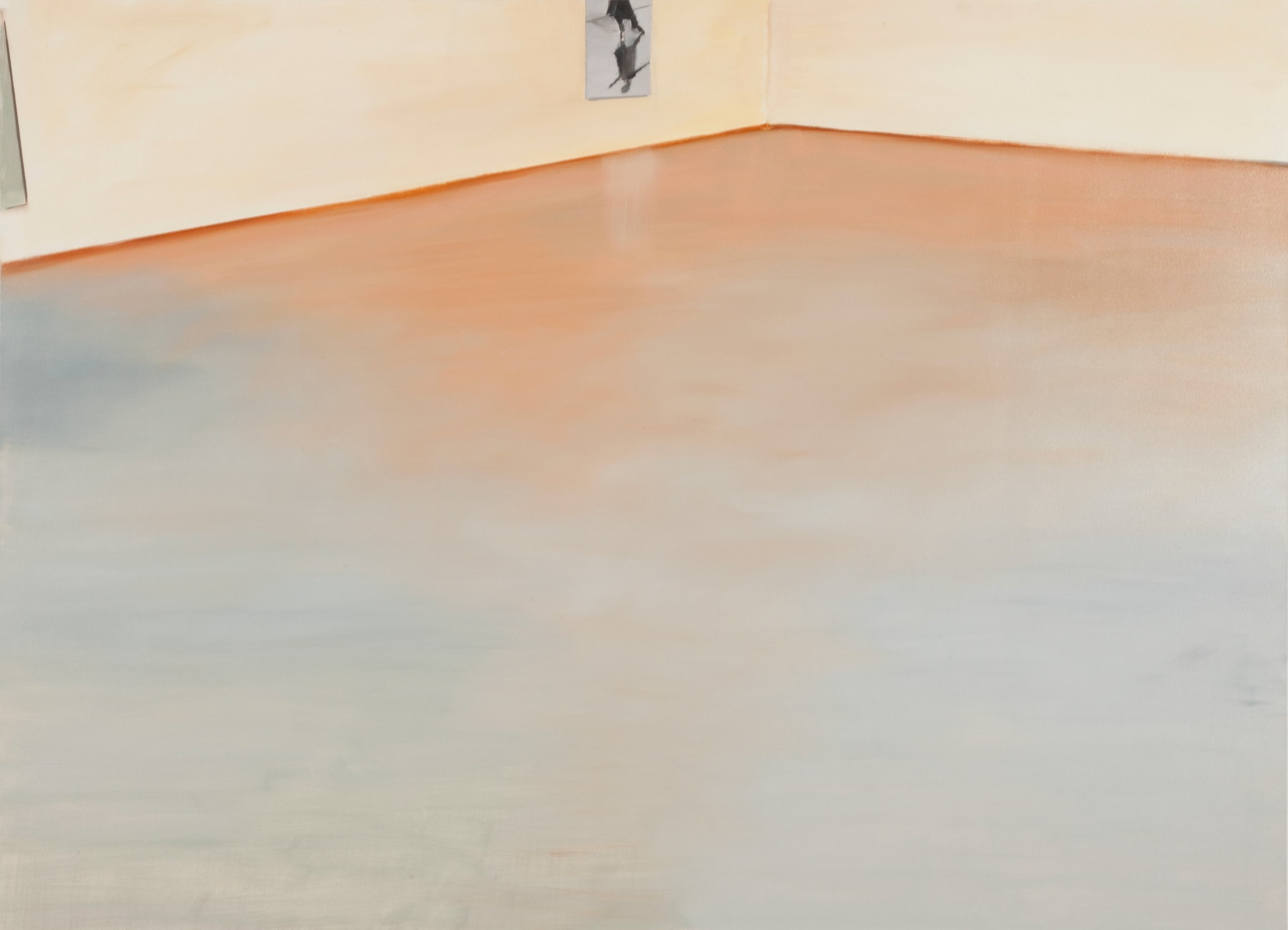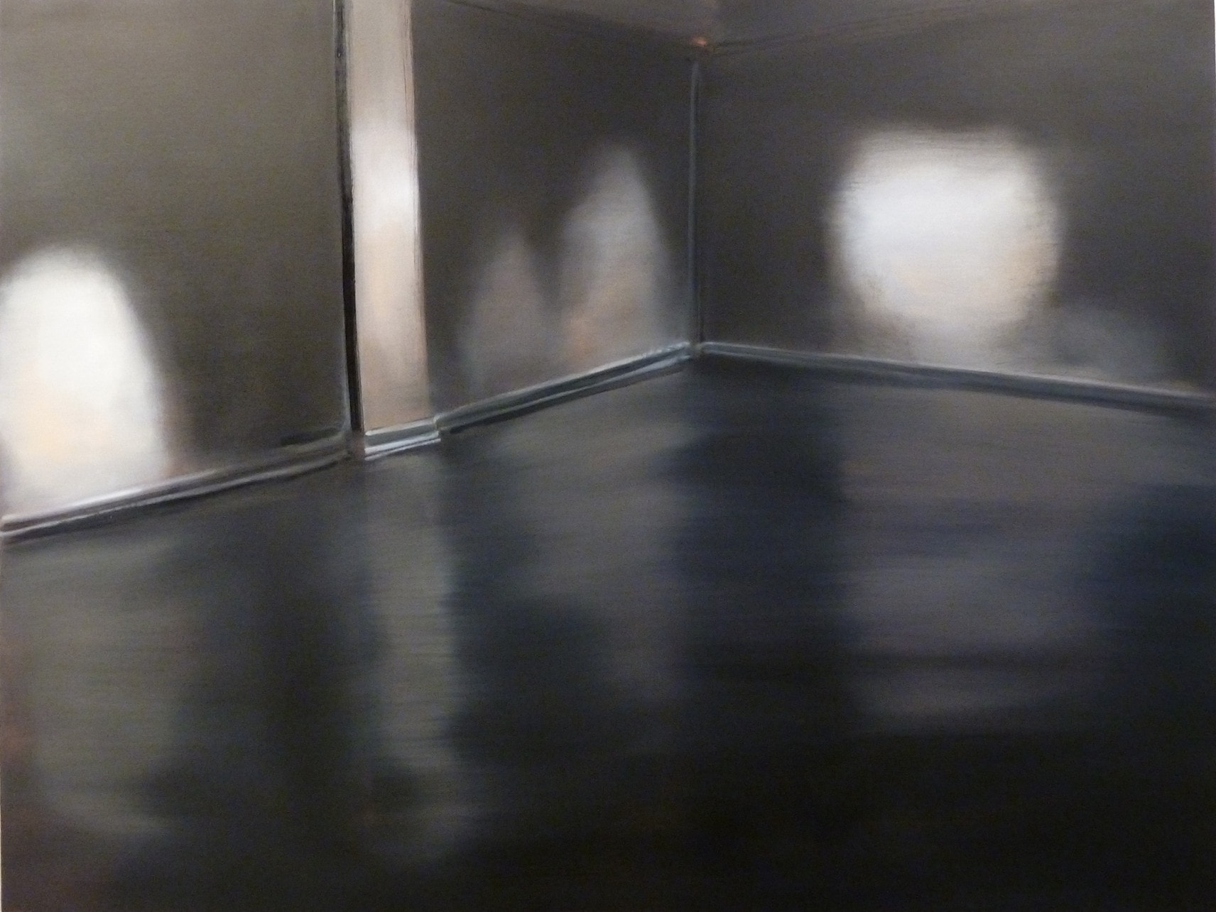Started about five years ago in the midst of a global financial crisis and continued through the lethargic rebuilding of capitalist markets, this series depicts stereotypically inert gallery spaces at once removed from the world at large and sharing in the desolation of spirit that filters in through an occasional window. Galleries have always been austere places of contemplation, but at the time this series was produced, another form of austerity took hold. Austerity as a coherent and seamless system is short-circuited by the way Irons handles paint; she chooses to accentuate and not conceal her facture. Hard surfaces and edges across the series are softened to a comical degree. Where one expects to find a pristine wall, Irons substitutes in a paint finish that expresses no qualms about being the work of human hands. On the contrary, the play of light and shadow that is an increasing rarity in uniformly lighted gallery spaces is emphasized as a way of expressing the contingency of viewing conditions—over the course of a day or several years. Black Gallery and Greene Naftali reveal a range of atmospheric conditions; the former is totally subdued save for sporadic glare on the wall from the spotlights overhead, and the latter is bathed in the late afternoon glow that gives the room a coppery tinge and turns the floor a murky teal shade.